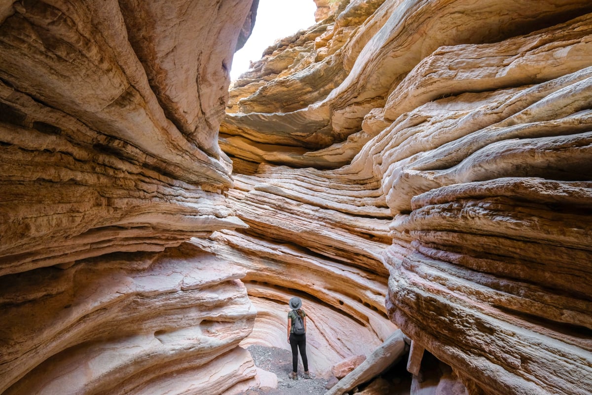 Compared to most slot canyons, this passageway is paper thin. Even if you’re a small person, you will absolutely have to walk sideways to get through the crack, and it’ll still be tight. It’s a fun challenge if you’re feeling brave!